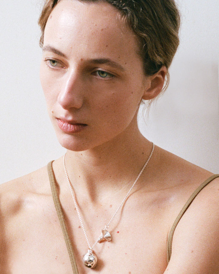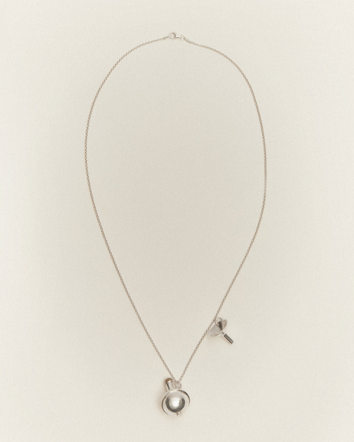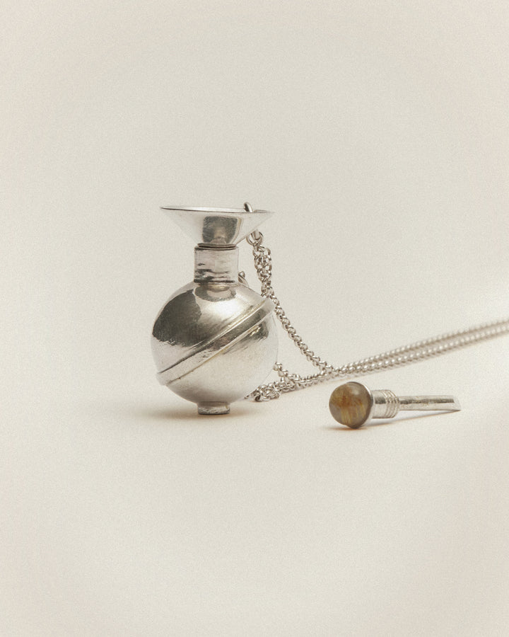 Une fiole à parfum ou huile monté d’un quartz rutile, son entonnoir et sa chaine, en argent massif. A emporter au tour de son cou grâce à sa chaine.
