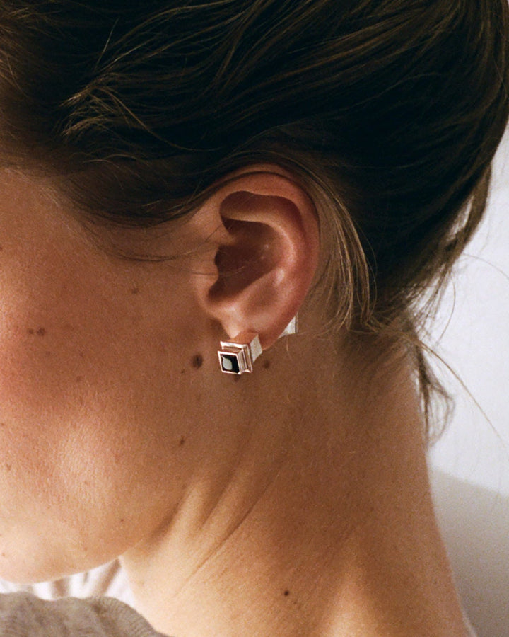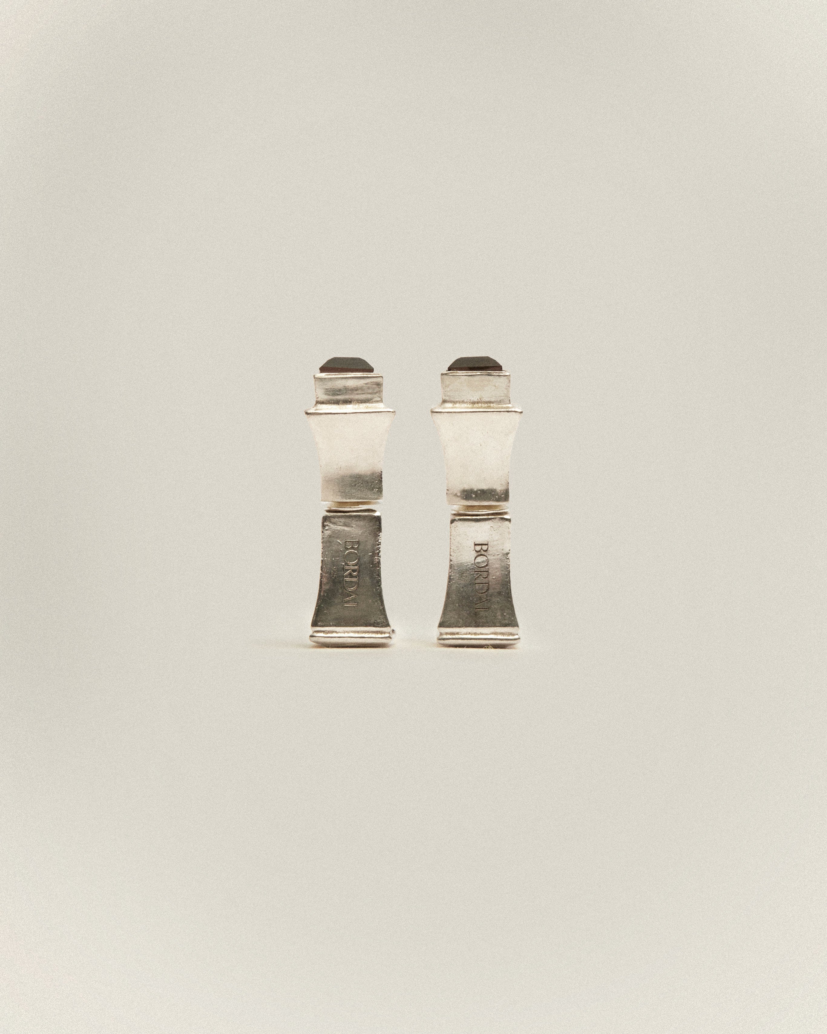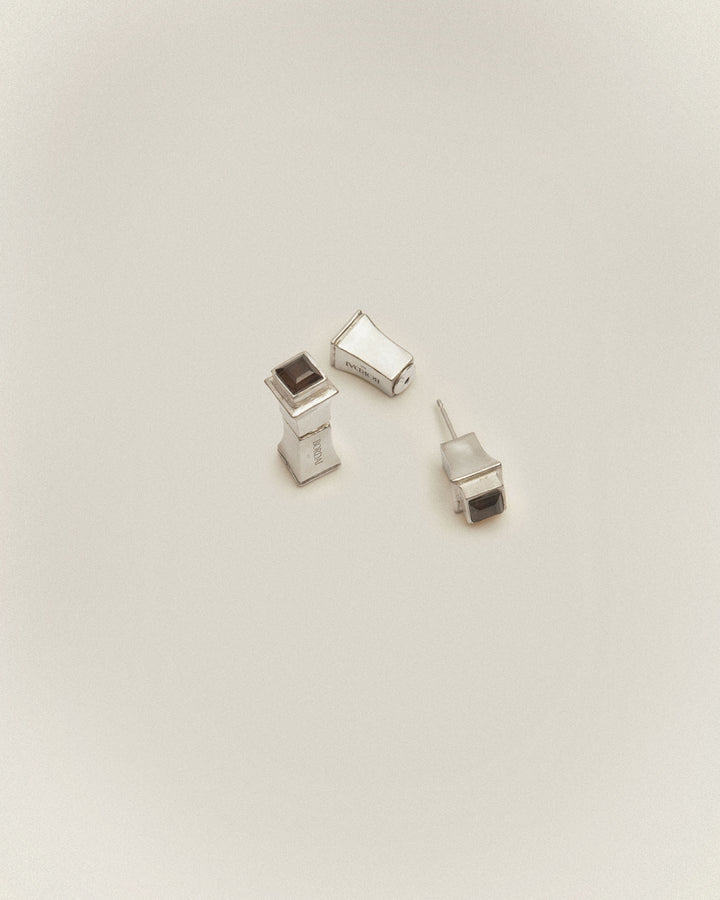 Double boucle d’oreille Pilier, en argent massif et quartz fumé.